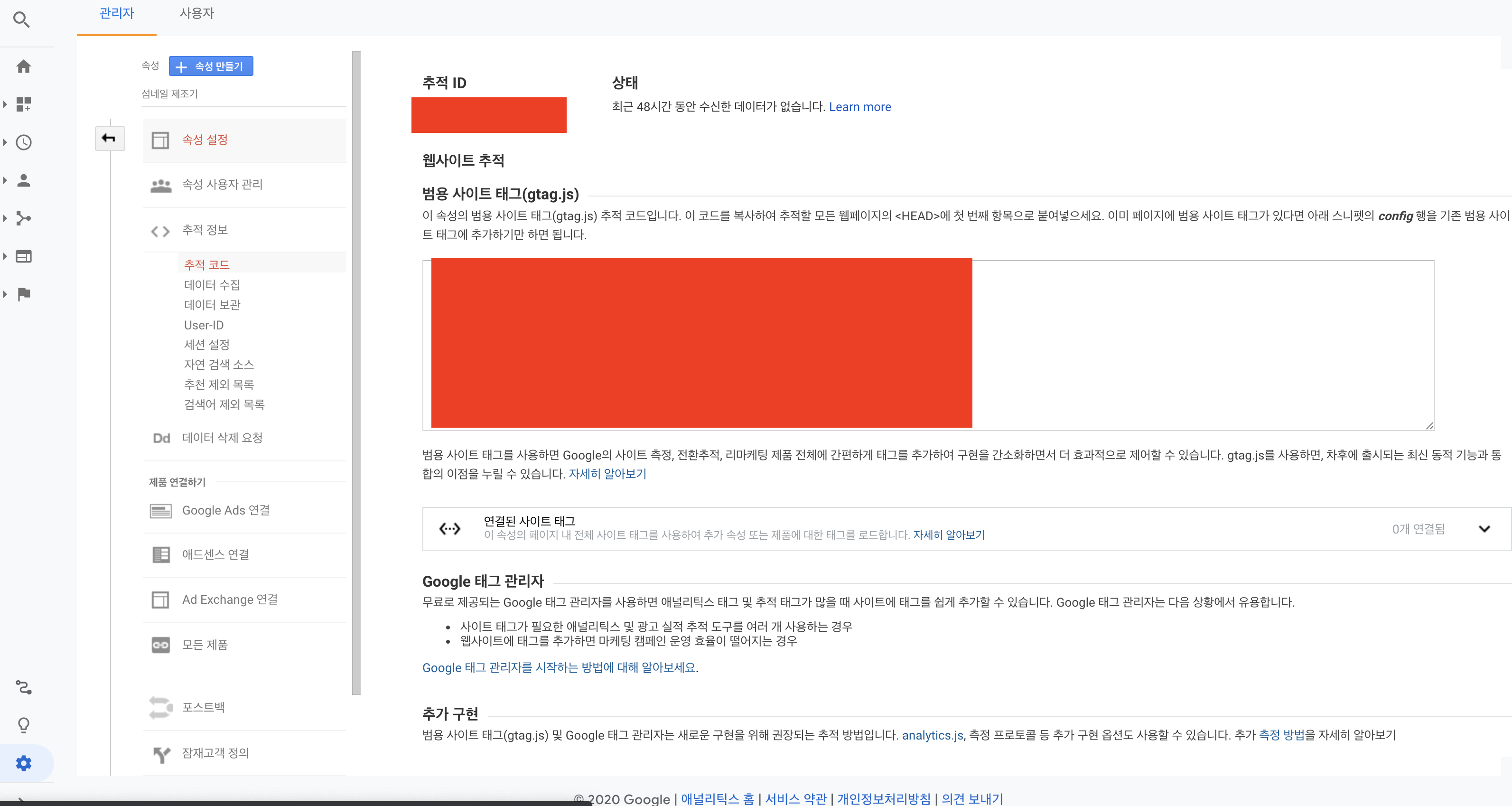 여기에 있는 추적ID 부분을 아까 티스토리 구글 애널리틱스 플러그인에 붙혀넣기 해줍니다.