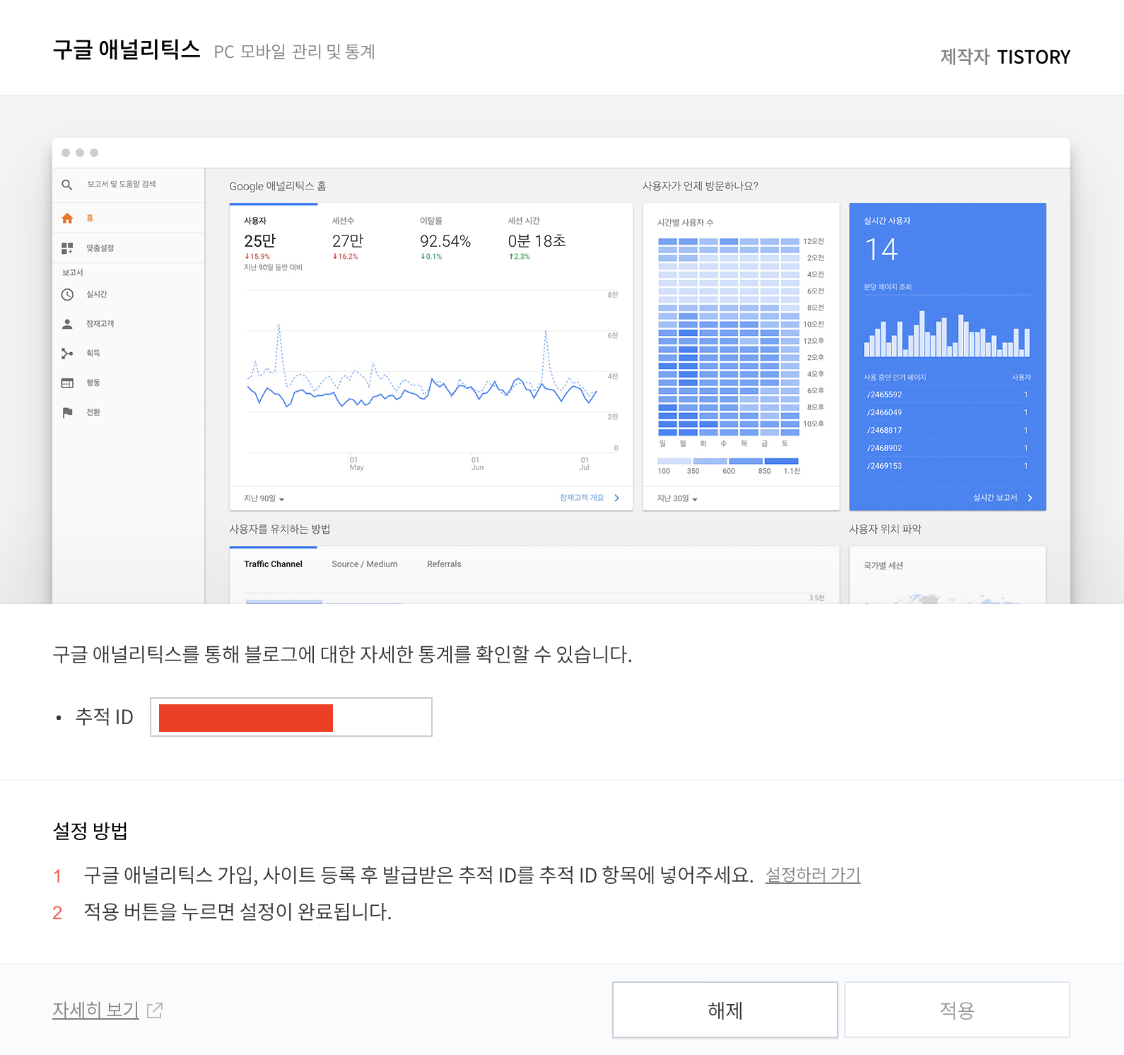 티스토리에서도 방문 통계를 제공해주지만 구글 애널리틱스만큼 강력하게 제공해주지는 않는데요.