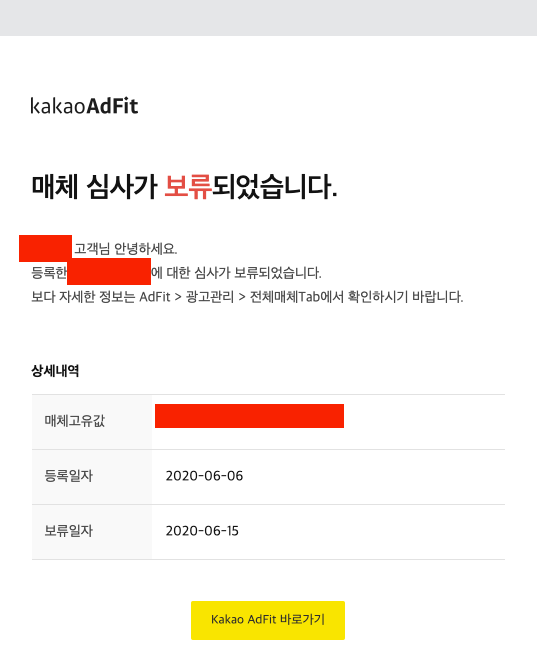 카카오 애드핏 광고 등록이 보류 되었을 경우 아래처럼 메일이 날라오고 카카오 애드핏 사이트에서도 보류된 사유를 확인하실 수 있습니다.