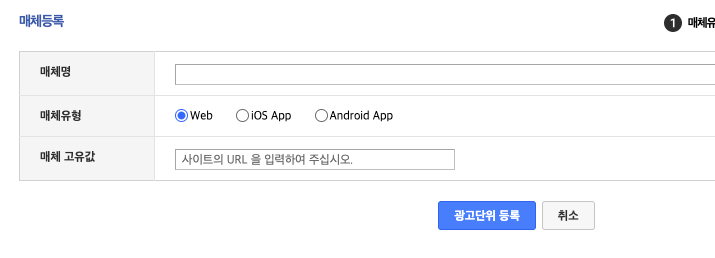 매체 명에는 사이트의 이름을 넣어주시고, 매체 유형은 웹사이트일 경우 Web, ios app에 광고를 게시하시려면 IOS App, 안드로이드 앱에 광고를 게시하시려면 Android App을 선택해주시면 됩니다. 매체 고유값은 갖고 계신 사이트의 url주소를 넣어주시면됩니다.