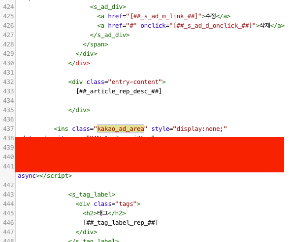 여기서 스크립트 복사 버튼을 눌러주신 후에 사이트의 원하시는 부분에 해당 스크립트를 붙혀넣으시면 됩니다. 저같은 경우는 티스토리의 HTML편집 기능을 통해 티스토리 블로그에 광고를 삽입해보록 하겠습니다. 저는 게시물의 마지막에 광고가 삽입이 되기를 원하니까 아래 위치에 해당 스크립트를 삽입했습니다.