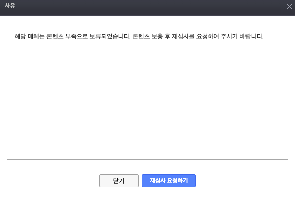 여기서 바로 재심사 요청하기를 할 수 도 있지만, 제가 해보니 바로 재심사 요청하기를 하면 다음날 바로 최근 콘텐츠 부족으로 보류된 항목이라고 다시 콘텐츠를 보충해서 심사 요청해달라는 메세지가 날라옵니다... 몇개의 글을 더 쓴 후에 재심사를 요청하시는 것을 추천드립니다.