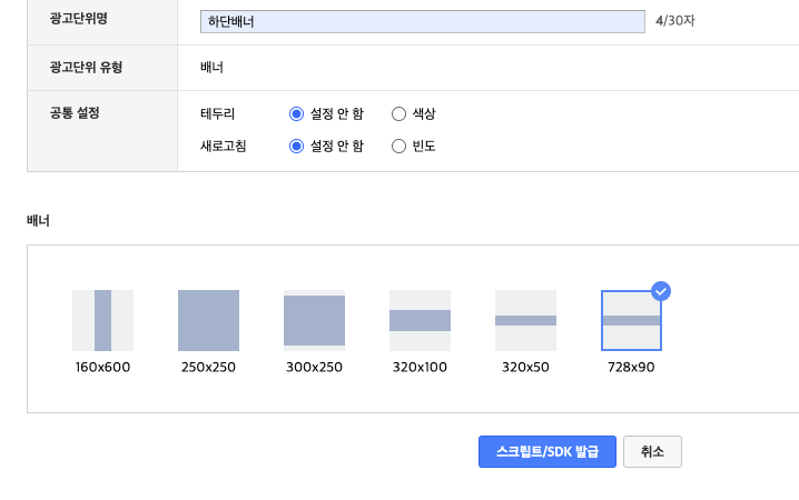그리고 광고의 사이즈를 골라주시면 됩니다. 저는 728x90 사이즈를 선택했습니다.