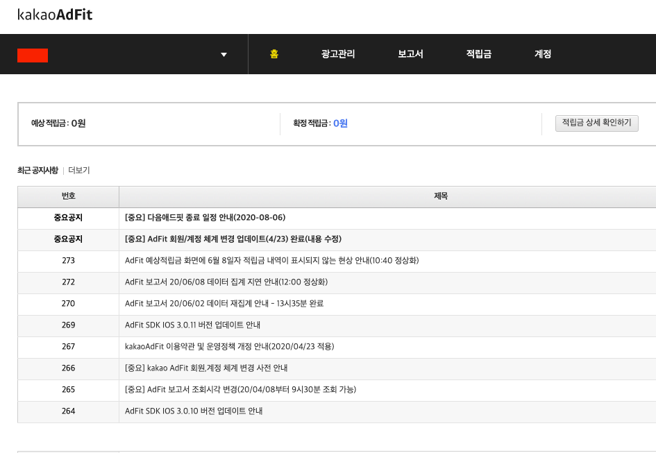우선 카카오 애드핏 사이트로 방문해줍니다. 아래와 같은 화면이 나오는데 여기서 광고 관리로 향해줍니다.