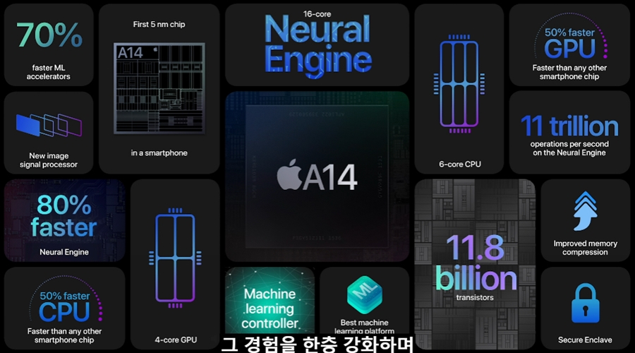 아이폰 12의 프로세서는 아이패드 에어에 탑재된 A14 바이오닉을 사용했고, 다른 스마트폰보다 50% 더 빠른 6코어 CPU, 다른 스마트폰보다 50% 더 빠른 4코어 GPU를 탑재했습니다. 이 또한 애플의 말장난인게 타사 스마트폰보다는 50% 더 빠르다고 하지만 아이폰 11보다는 15% 정도 빨라진 속도라고 합니다. 그래도 결과적으로 기존보다 80% 빨라진 16코어 뉴럴 엔진을 탑재해 초당 11조번 연산이 가능하며, ML 가속기의 성능도 70% 높였습니다.