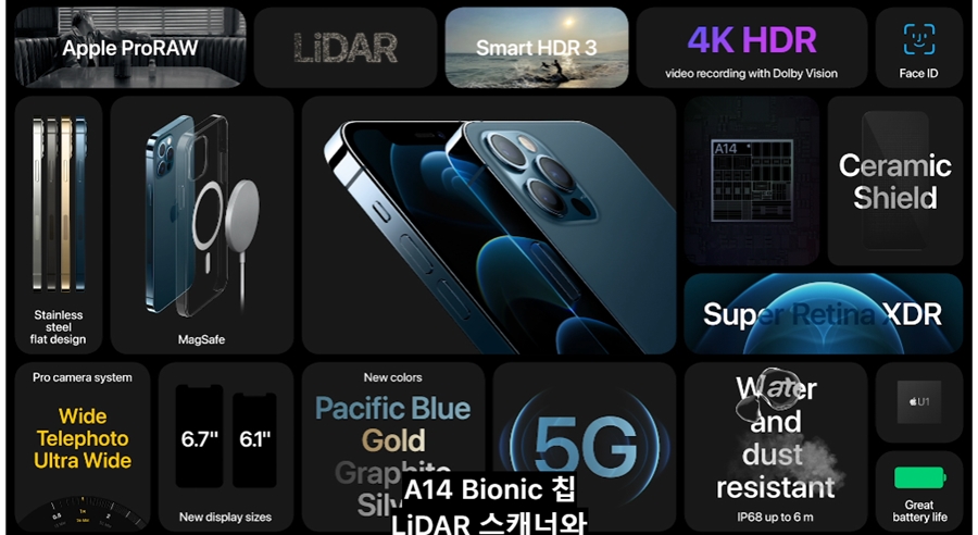 아이패드 프로에서나 사용하던 라이다 센서가 아이폰 12 프로부터 탑재됐습니다. 레이저를 쏴서 돌아오는 신호를 통해 사물을 3D 인식하는 기술로, 방 정도의 규모를 스캔할 수 있다. 5G와 결합해서 공간을 보여주면 다른 사용자가 그 공간에 사물을 실시간으로 영상통화하듯이 배치해보는 충격적인 AR 을 사용하는 중요한 앱도 출시할 예정인 것 같습니다.